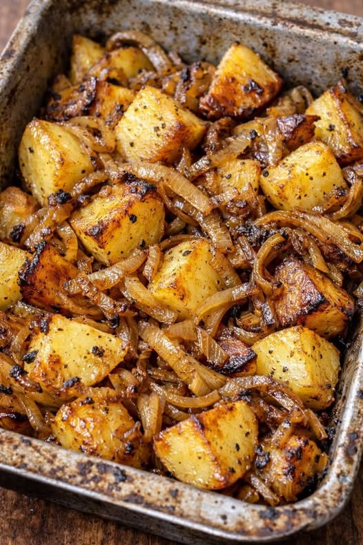 Tálald ezeket az amis sült krumplit és hagymát közvetlenül a vintage stílusú fém sütőtálból, kanalazva őket egy tálba, amíg még sercegnek és karamellizálódnak a széleik körül. Tökéletesen illenek klasszikus vasárnapi főételekhez, mint a sült csirke, fasírt, sült sonka vagy sült marhahús, de egyszerű hétköznapi fehérjeételekhez is illik, mint például a serpenyőben sült sertésszelet vagy a sült lazac. Adj hozzá ropogós zöldsalátát vagy párolt zöldbabot, hogy kerek legyen a tányér. A maradékot remekül felmelegítheted egy serpenyőben sült tojással, így könnyű reggelit vagy gyors ebédet kapsz.