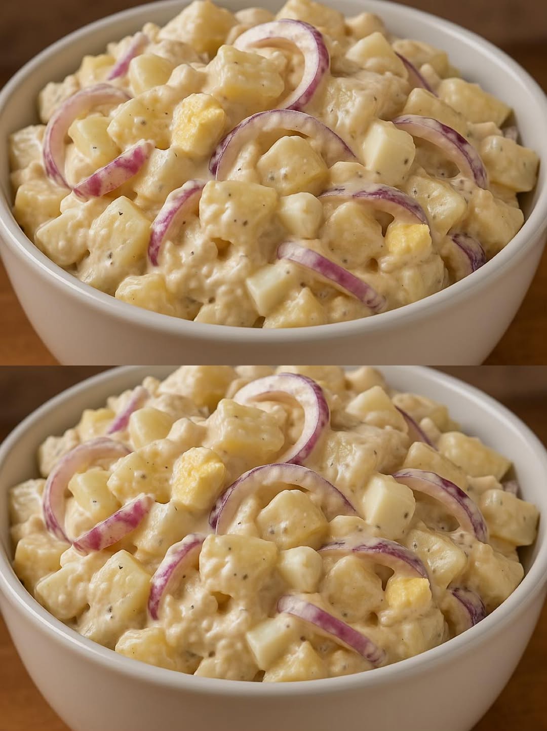 Ez a lilahagymás majonézes krumplisaláta tipikusan az a fogás, ami szinte minden családi összejövetelen előkerül, nálunk abszolút az április sztárja. Egyszerű, laktató, és valahogy mindig elfogy az utolsó falatig, még akkor is, ha elsőre soknak tűnik. A lilahagyma ad neki egy kis karaktert, a majonézes öntet pedig szépen összefogja az egészet. Nem egy bonyolult recept, inkább az a fajta, amit „érzésre” csinál az ember. Ráadásul másnapra még finomabb lesz, amikor az ízek jól összeérnek.