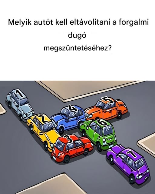 A képen (képzeljük el magunk előtt) hét autó teljes káoszt teremt. A feladatod, hogy megoldást találj a problémára: mozdíts el csak egy autót, és minden világos lesz.
